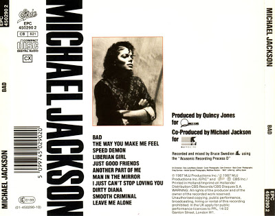 portada bad 18 de septiembre de 2009 - 15:58 - bad aqui les presento las portadas delantera y trasera del albun badaqui les dejo una lista de enlaces de los videos:Disco 1 Letras Video 1 Bad 2 The Way You Make Me Feel 3 Speed Demon 4 Liberian Girl 5 Just Good Friends 6 Another Part Of Me 7 Man In The Mirror 8 I Just Can't Stop Loving You 9 Dirty Diana 10 Smooth Criminal 11 Leave Me Alone Facebook Twitter Whatsapp Email